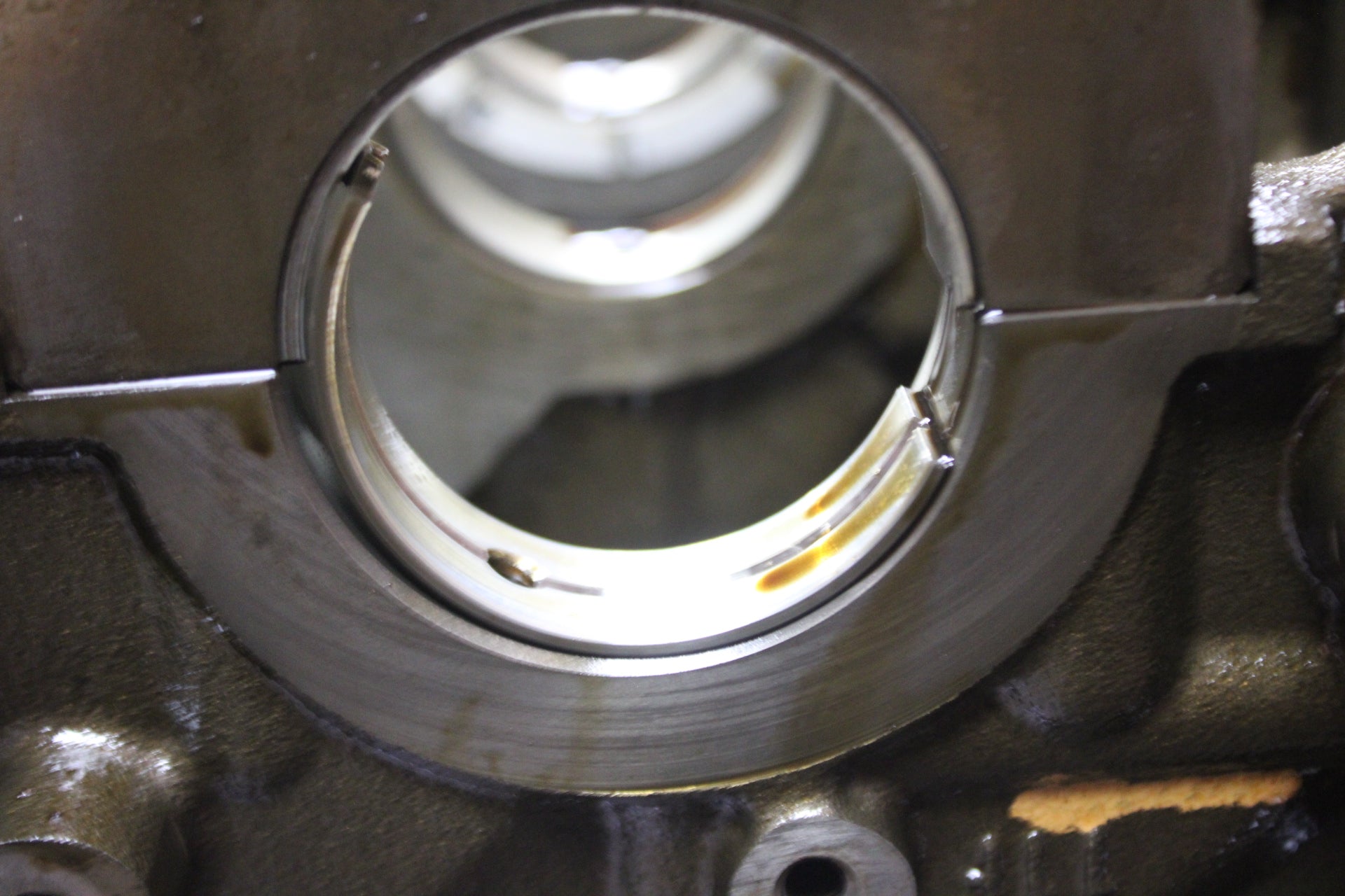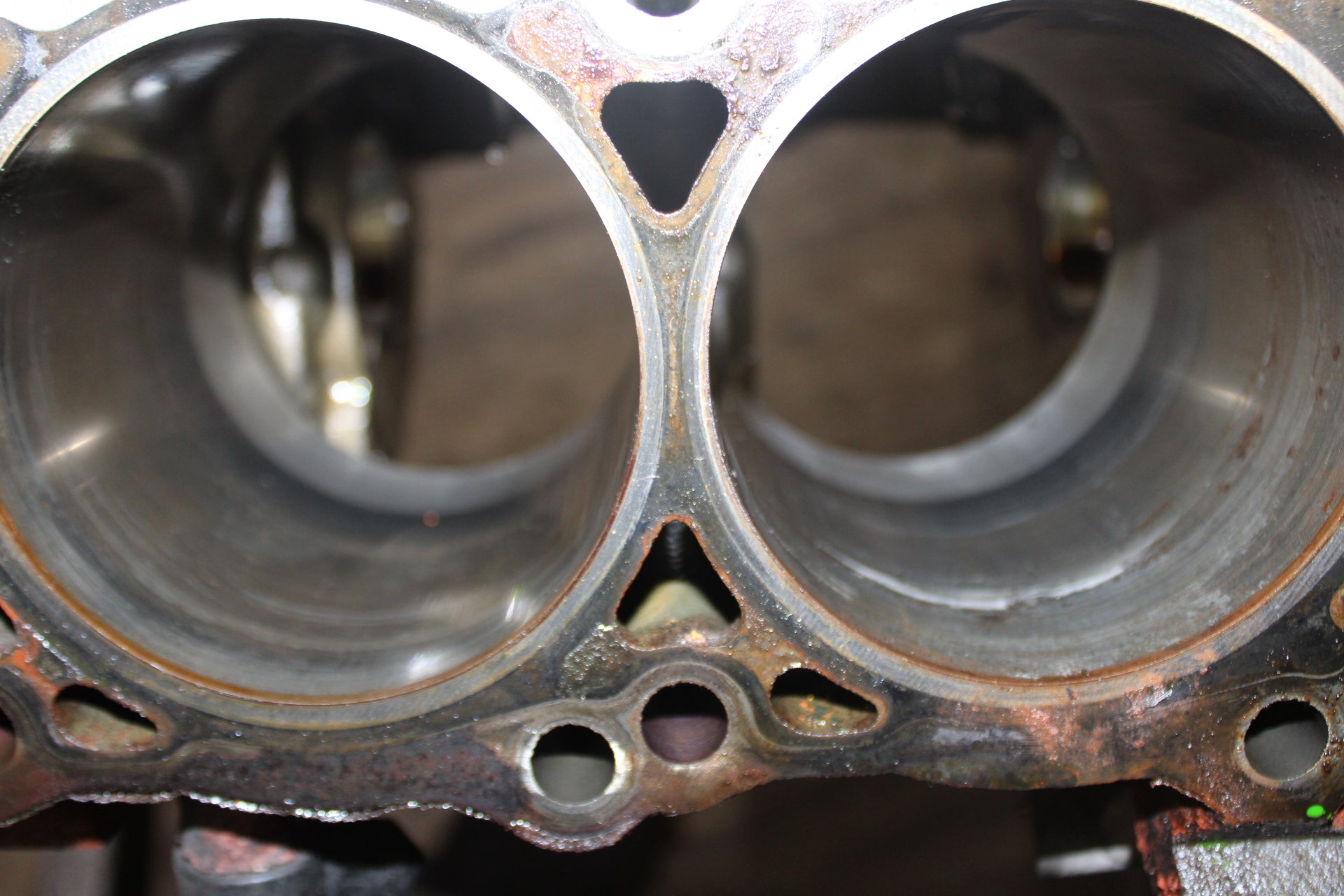 MACHINING REQUIRED. Has decent knick in bottom of a cylinder, some rust and water spots on the bores, cross hatching is still apparent, bearing surfaces looked unharmed, cam journals looked good, old bearings and not cleaned so DISASSEMBLE, CLEAN, AND INSPECT WELL.